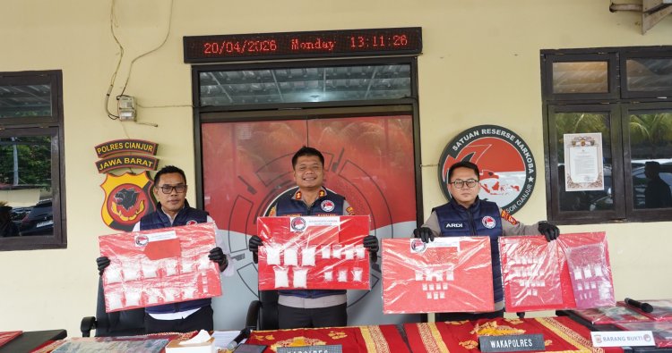Kapolres Cianjur AKBP Dr. A. Alexander Yurikho Hadi, S.H., S.I.K., M.Si., M.M., M.H.I., M.I.P. memimpin kegiatan press release pengungkapan kasus narkotika jenis sabu oleh Satresnarkoba Polres Cianjur yang berlangsung di depan Gedung Satresnarkoba Polres Cianjur, Senin (20/4/2026). Kegiatan tersebut turut dihadiri Wakapolres Cianjur KOMPOL Mohamad Ardi Wibowo, S.H., S.I.K., M.H., serta Kasatresnarkoba Polres Cianjur AKP Tatang Sunarya, S.E., M.H.
